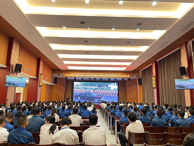 9月3日上午,350vip浦京电气一楼多功能厅气氛庄重而热烈,350vip浦京集团400余名在家员工齐聚一堂,集中观看中国人民抗日战争暨世界反法西斯战争胜利80周年现场直播。