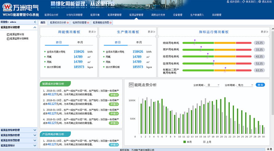 WEMS能源管理中心系统为350vip浦京系统节能系列产品之一,通过对生产过程全能源消耗的数据进行采集、加工、分析、处理以实现对能源计划、能源实绩、能源预测、能源质量与物料供应、能源平衡与生产调度等全方位的监管和综合分析。实现统一生产调度、统一能源配给,达到能源精细化管控、优化生产优化能耗的目的,真正起到提高企业生产与能源管理水平、提高企业能源利用效率,降低单位产品综合能耗的作用。
